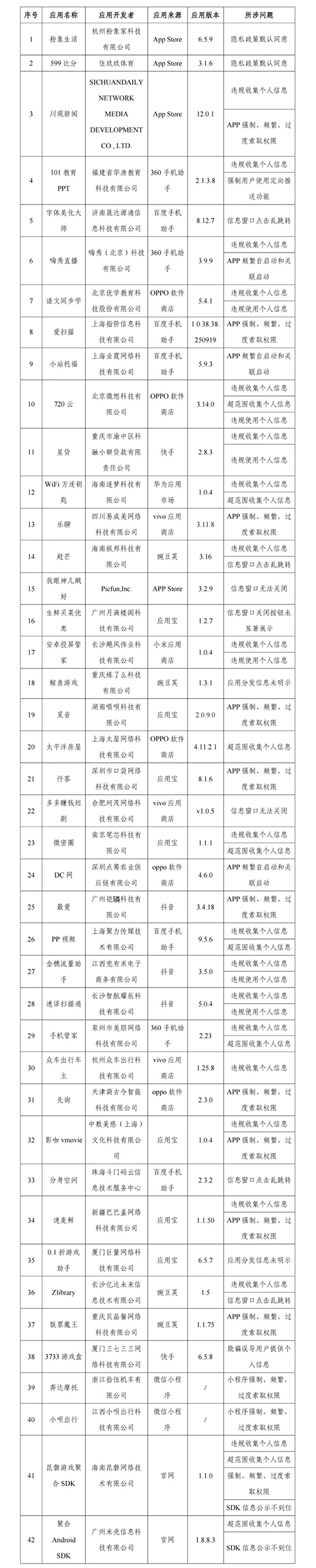 중앙인터넷안전정보화위원회판공실, 공업정보화부, 공안부, 시장감독관리총국 등 4개 부문이 공동으로 발표한 <2025년 개인정보보호 계렬 특별행동을 전개할 데 관한 공고>에 따라 공업정보화부는 앱과 SDK의 개인정보 불법 수집과 사용 등 문제에 대해 관리를 진행했다. 최근 제3자 관측 기관을 조직해 샘플검사를 한 결과, 총 42개 앱과 SDK에 사용자권익 침해행위가 있는 것으로 발견되여 이를 공개한다.