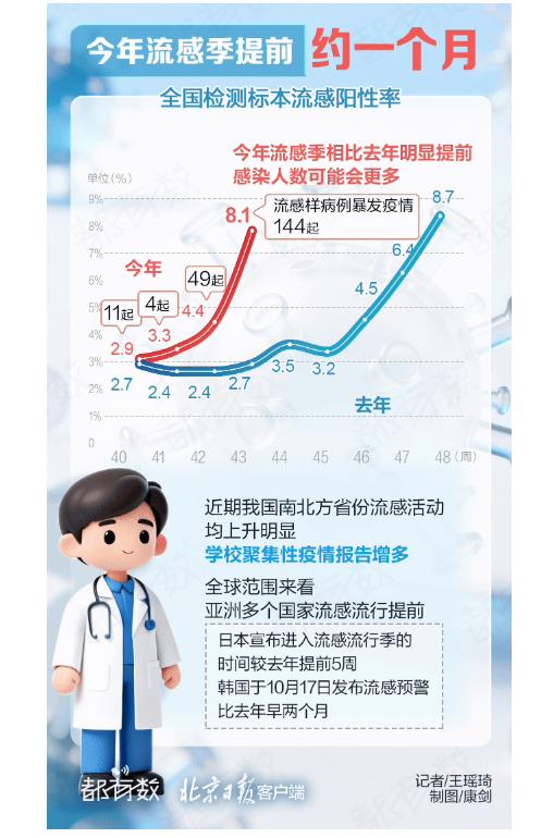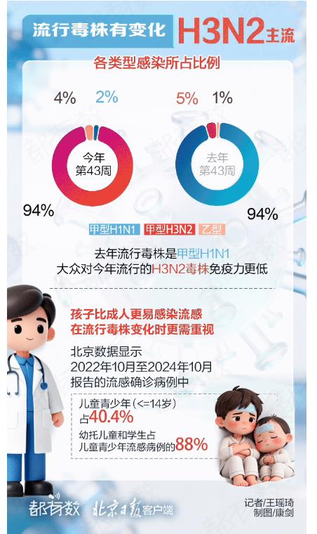 북경시 독감모니터링데터에 따르면 어린이군체가 심각한 독감위협에 직면해있다고 한다. 북경의 연구데터에 따르면 0세-4세 그룹의 발병률이 각각 33.0%와 21.7%로 가장 높고 2022년 10월부터 2024년 10월까지 보고된 독감환자중 어린이와 청소년(<=14세)이 40.42%를 차지했으며 탁아기구 어린이와 학생이 어린이 청소년 독감사례의 88%를 차지했다.