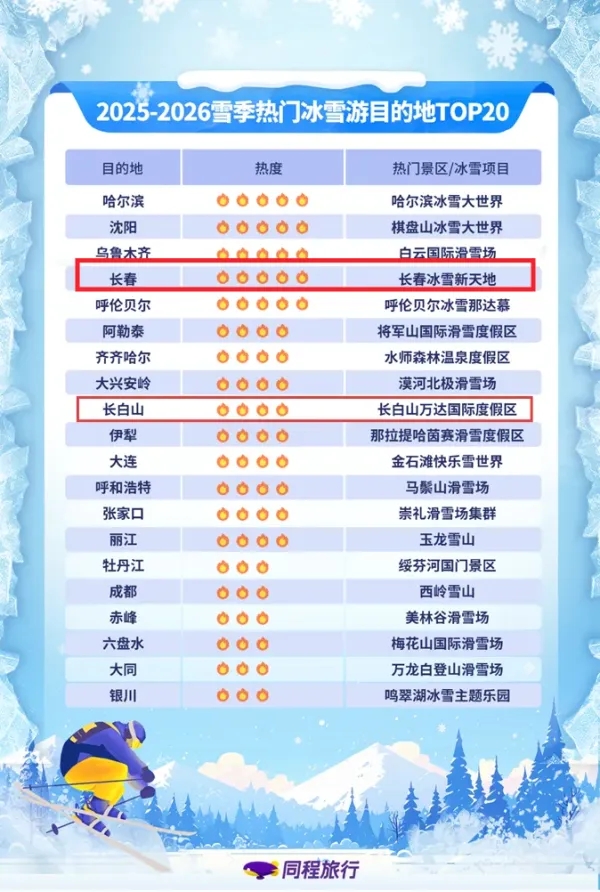 최근 동정려행(同程旅行)은 <2025-2026 빙설시즌 빙설관광 추세보고>를 발표했는데 장춘과 장백산이 전국 인기 빙설관광 목적지 TOP10에 당당히 입선되였다.