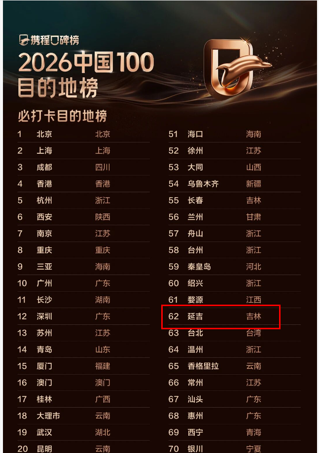 최근 씨트립 평판순위는 ‘2026 중국 100대 목적지 순위’를 공식 발표했다. 연길은 높은 인기와 뛰여난 종합실력을 바탕으로 성공적으로 선정되여 필수방문목적지 62위에 올랐다. 이는 연길시가 3년 련속 이 순위에 오른 것이다.