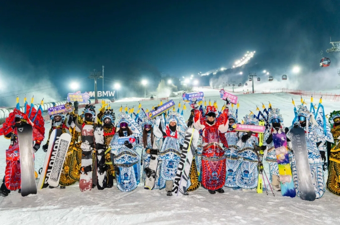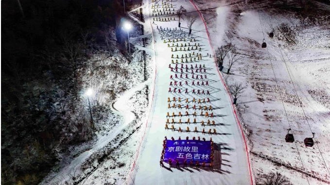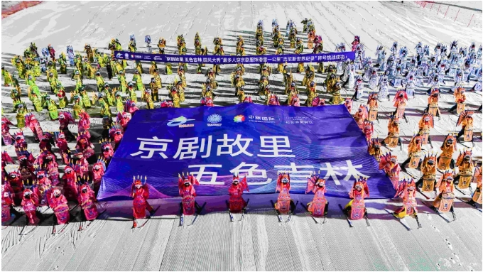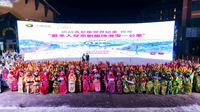 11월 21일 저녁, 길림성 송화호리조트는 력사적인 장면을 맞이했다. 오색령롱한 경극 의상을 입고 기발을 등에 꽂은 채 경극 분장을 한 266명의 스키어들이 정연한 대렬을 이루어 스키트랙에서 질주하며 ‘가장 많은 사람이 경극 의상을 입고 1km 스키 타기’ 도전을 성공적으로 완료하여 새로운 기네스세계기록을 세웠다.