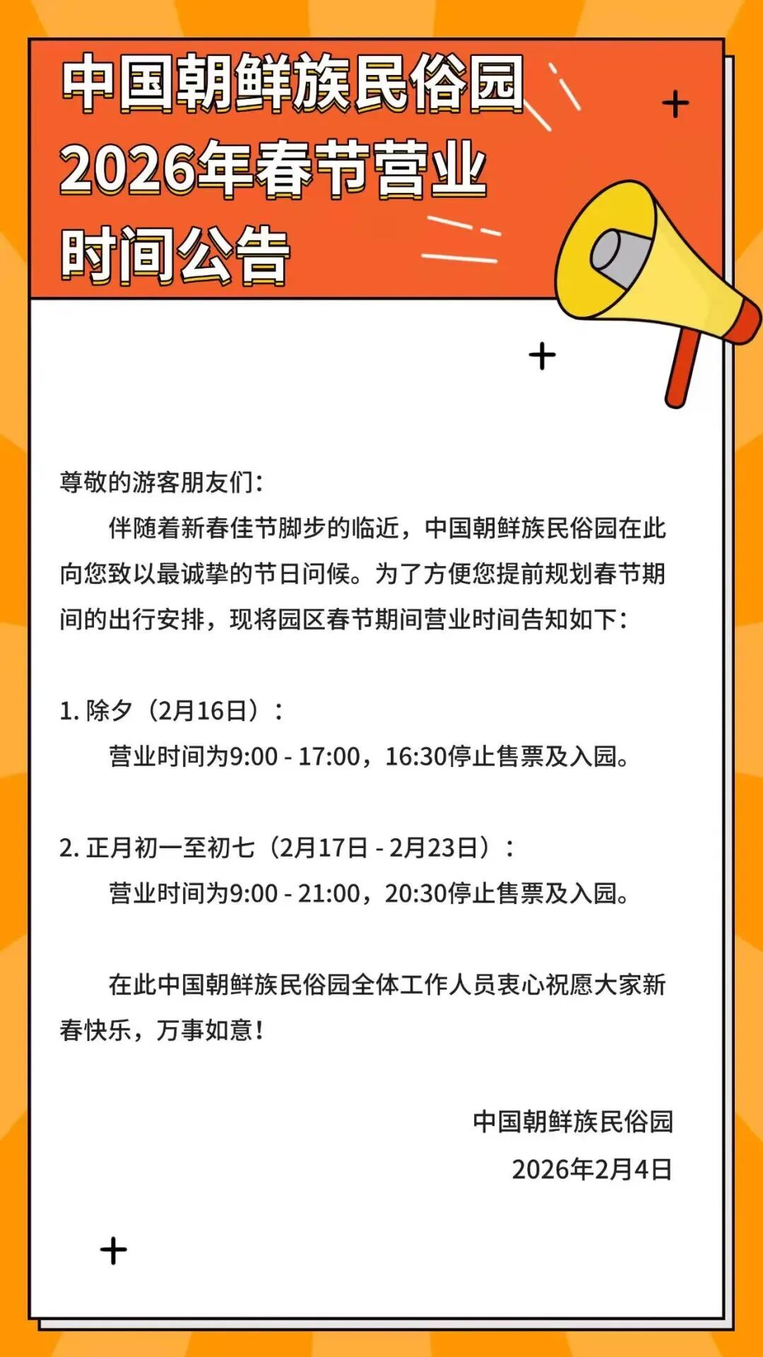 음력설이 다가옴에 따라 중국조선족민속원은 관광객 여러분에게 가장 진심어린 명절 인사를 전한다. 관광객 여러분이 음력설기간의 출행일정을 미리 세울 수 있도록 아래에 중국조선족민속원 음력설기간 영업시간을 아래와 같이 통지한다.
