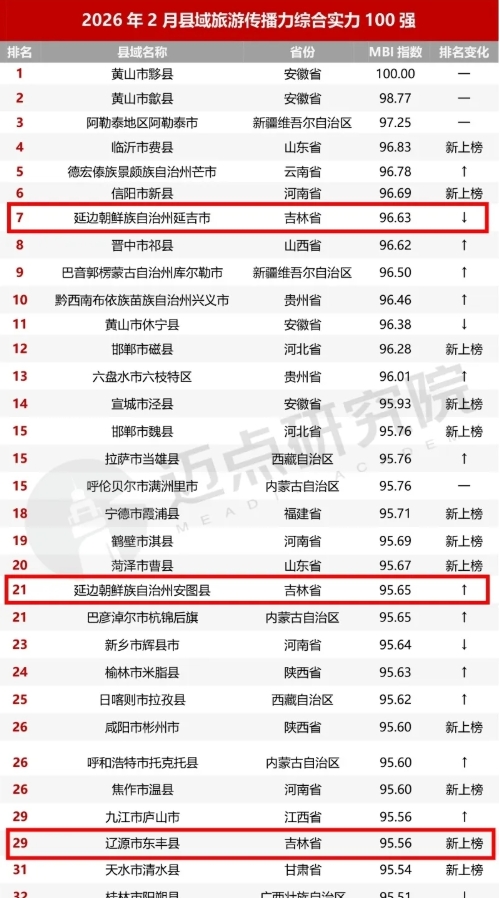 일전에 매점(迈点)연구원은 2026년 2월 현역관광전파력 종합실력 100강 순위를 발표했다. 길림성에서 연길시, 안도현과 료원시 동풍현이 순위에 이름을 올렸다.